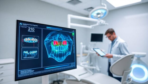 Kunstmatige intelligentie (AI) heeft het landschap van diagnostische nauwkeurigheid in de tandheelkunde veranderd. Het verbetert het vermogen om mondgezondheidsproblemen effectiever te identificeren dan traditionele methoden. Je kunt vertrouwen op AI-algoritmes om röntgenfoto's en andere beeldstudies te analyseren, waarbij ze gaatjes, breuken of parodontalen ziekten met opmerkelijke precisie opsporen. Deze tools gebruiken enorme databases van tandheelkundige beelden om patronen te leren, waardoor hun diagnostische mogelijkheden in de loop van de tijd verbeteren. Door AI in je praktijk te integreren, kun je menselijke fouten verminderen, wat zorgt voor betrouwbaardere beoordelingen. Bovendien kunnen AI-systemen gevallen op basis van urgentie prioriteren, wat je helpt om middelen effectief in te zetten. Hierdoor krijgen je patiënten tijdige en nauwkeurige diagnoses, wat het vertrouwen vergroot en de algehele behandelresultaten verbetert. AI omarmen in diagnostiek kan je tandartspraktijk aanzienlijk verbeteren.